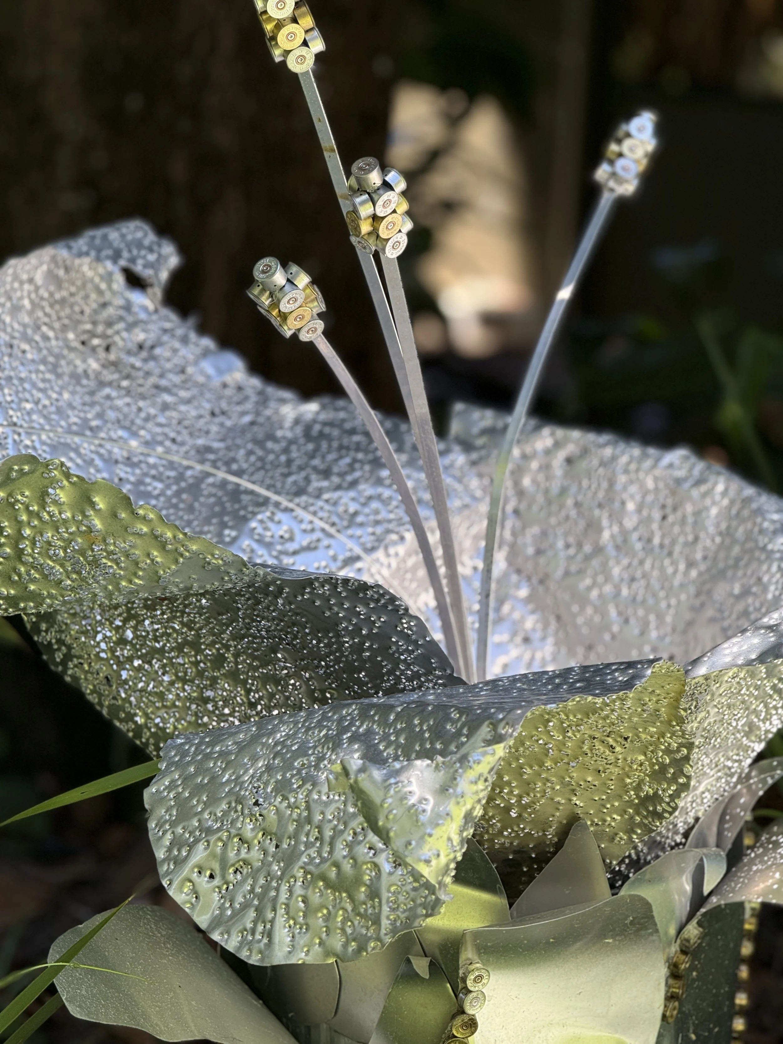 No longer interested in the application of paint to render the world in expressive or colourful ways, Rae’s work is unique in that her primary mark making tool is a 12 gauge shot gun. Drawing on over twenty years’ experience as a target shooter her process favours chance and chaos, over any sense of pictorial order, and is executed in the safety of a gun club Her high velocity mark making takes aim at a range of substrates including canvas, aluminium and copper and seeks to reveal and elicit intense physical and emotional gestures. These gestures are then translated into two and three-dimensional forms.